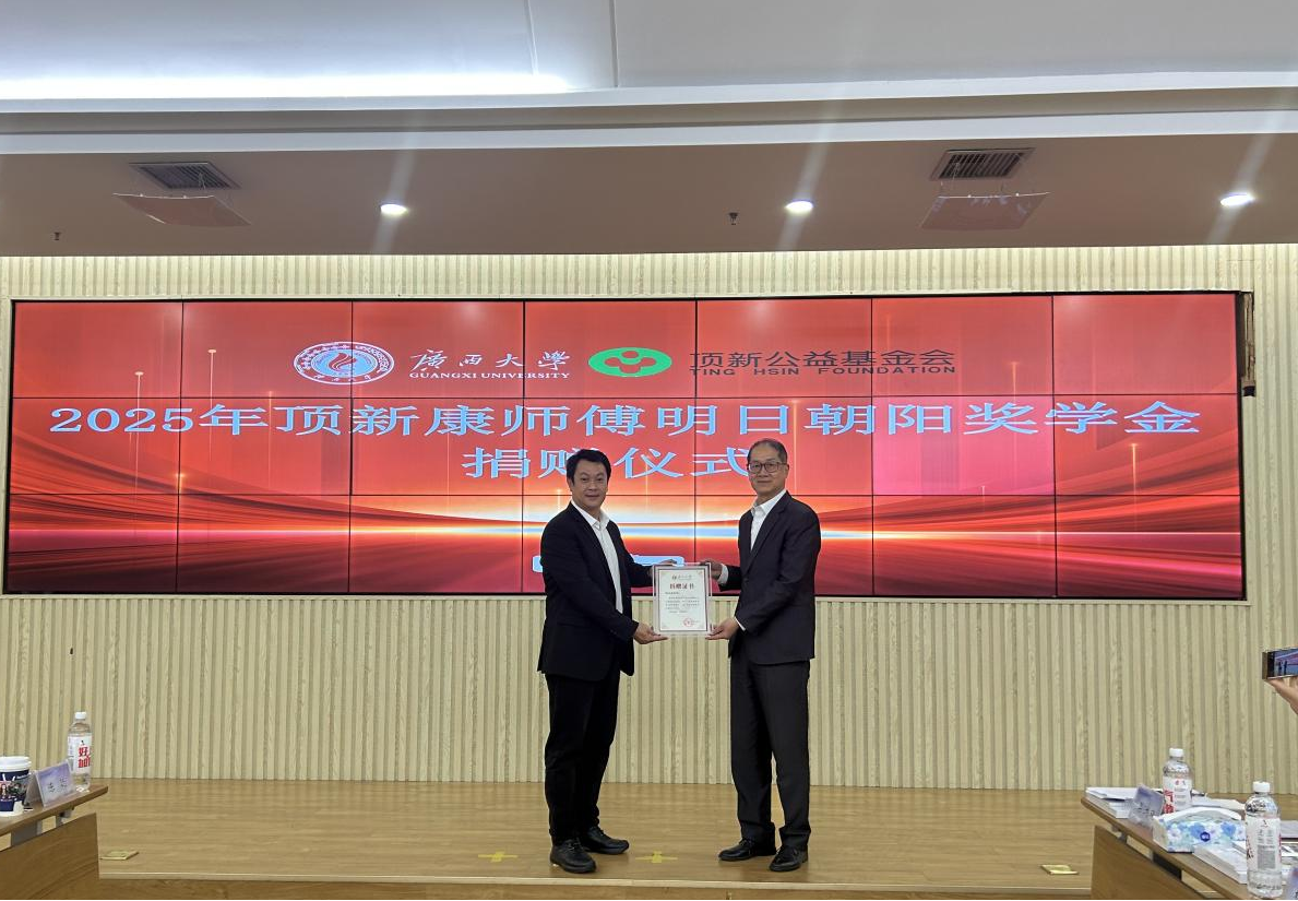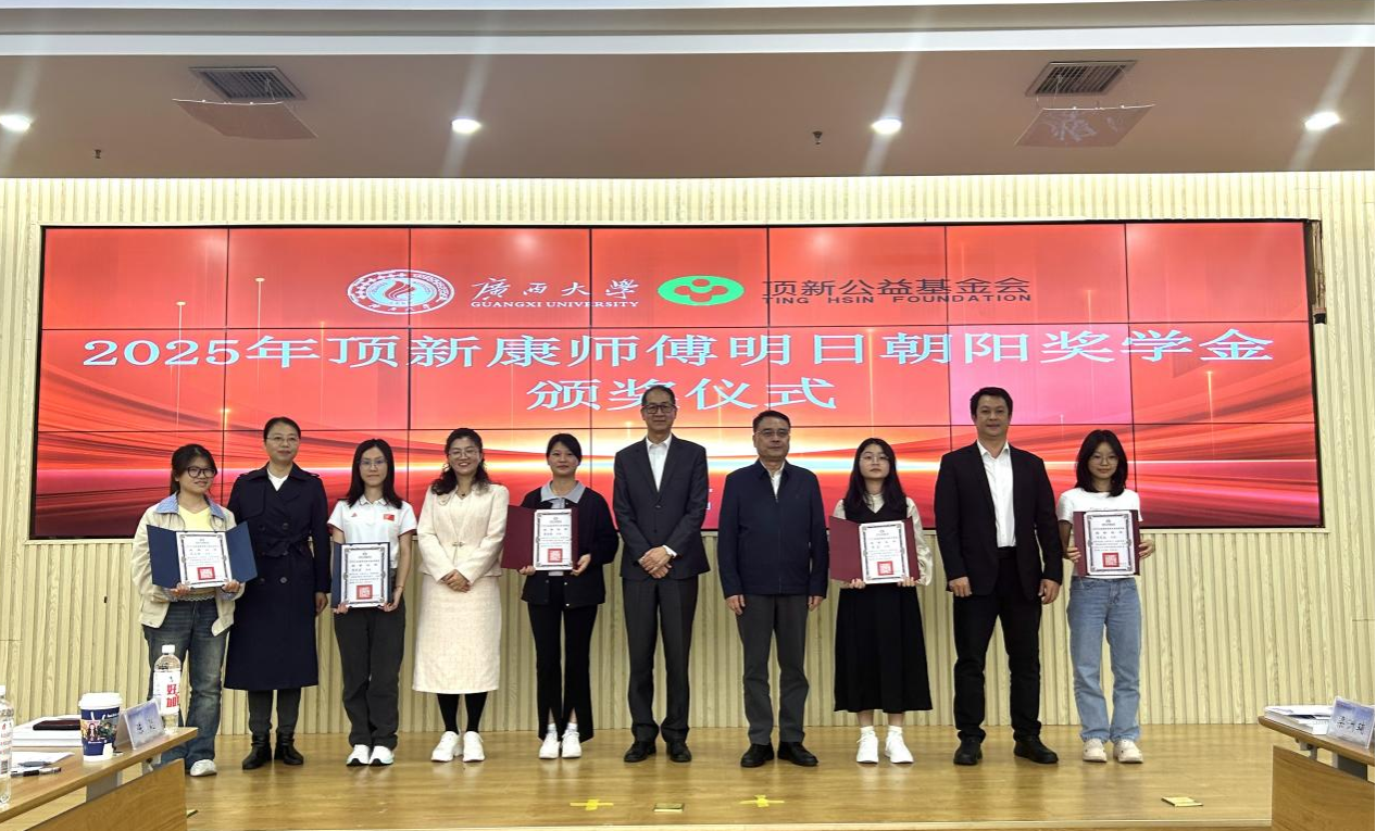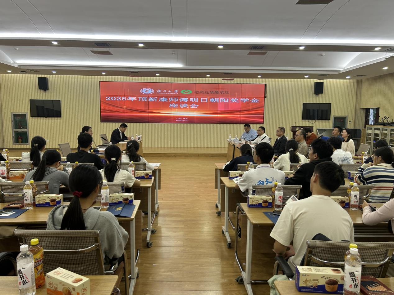 11月11日,我校2025年顶新康师傅明日朝阳奖学金爱心见面会暨颁奖仪式在校友服务中心报告厅举行。顶新国际集团北京代表处首席代表、顶新公益基金会副秘书长滕鸿年,康师傅、德克士公司代表,广西台湾事务办公室原副主任林承格、全国台企联常务副会长林易陞、南宁市台协会副会长梁洲辅等嘉宾,及我校党委常委、校长助理、党委统战部部长姚作芳,教育发展基金会秘书长周海斌等共同出席活动。